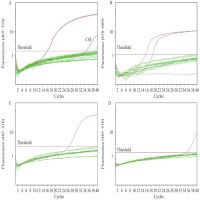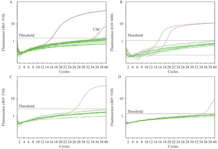 图1. 通过rtPCR鉴定首例人类感染猴B病毒的病例。(A)BV的rtPCR检测结果;(B)VZV的rtPCR检测结果;(C)猴痘病毒的rtPCR检测结果;(D)正痘病毒的rtPCR检测结果。