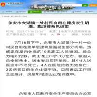 永安市政府消息通报称,7月16日下午,永安市大湖镇冲一村一处村民自用在建单层建筑屋面发生部分坍塌,造成正在屋内休息的10名施工人员被困。经全力组织抢救,截止晚上8时30分左右,被困人员全部救出,送永安总医院抢救,其中4人送医途中不治死亡,4人在医院抢救无效身亡,2名伤者目前生命体征平稳。目前善后工作已全面展开,房屋坍塌原因正在调查中。