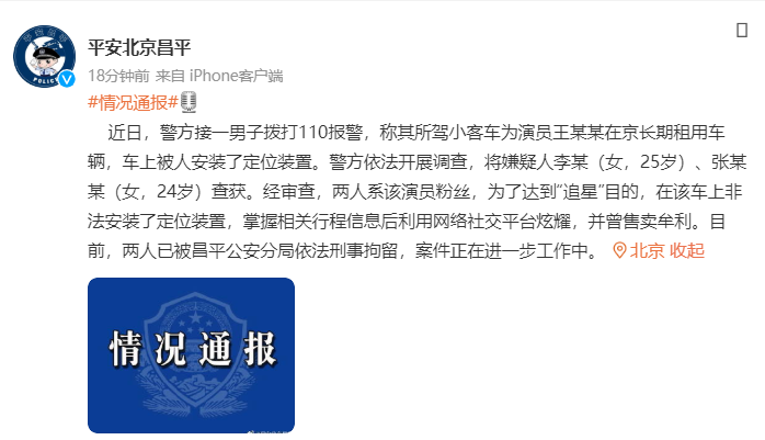 近日,警方接一男子拨打110报警,称其所驾小客车为演员王某某在京长期租用车辆,车上被人安装了定位装置。警方依法开展调查,将嫌疑人李某(女,25岁)、张某某(女,24岁)查获。经审查,两人系该演员粉丝,为了达到“追星”目的,在该车上非法安装了定位装置,掌握相关行程信息后利用网络社交平台炫耀,并曾售卖牟利。目前,两人已被昌平公安分局依法刑事拘留,案件正在进一步工作中。