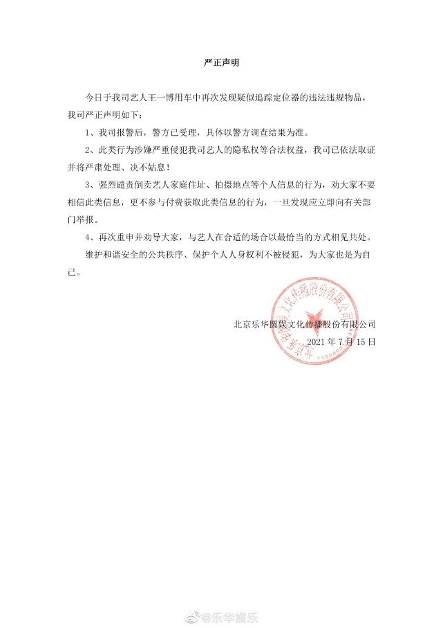 7月15日,@乐华娱乐 曾发布声明称,于旗下艺人王一博用车中再次发现疑似追踪定位器的违法违规物品。