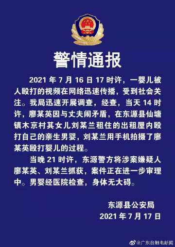2021年7月16日17 时许,一婴儿被人殴打的视频在网络迅速传播,受到社会关注。我局迅速开展调查,经查,当天14时许,廖某英因与丈夫闹矛盾,在东源县仙塘镇木京村其女儿刘某兰租住的出租屋内殴打自己的亲生男婴,刘某兰用手机拍摄了廖某英殴打婴儿的过程。