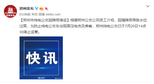 据@郑州发布,根据郑州公交公司员工介绍,因强降雨导致水位过高,为防止纯电公交车出现高压电伤及乘客,郑州纯电公交已于7月20日14点30停止运营。