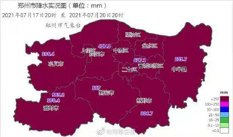 19日20时到20日20时,单日降雨量552.5mm。17日20时到20日20时,三天的过程降雨量617.1mm。其中小时降水,单日降水均已突破自1951年郑州建站以来60年的历史记录。