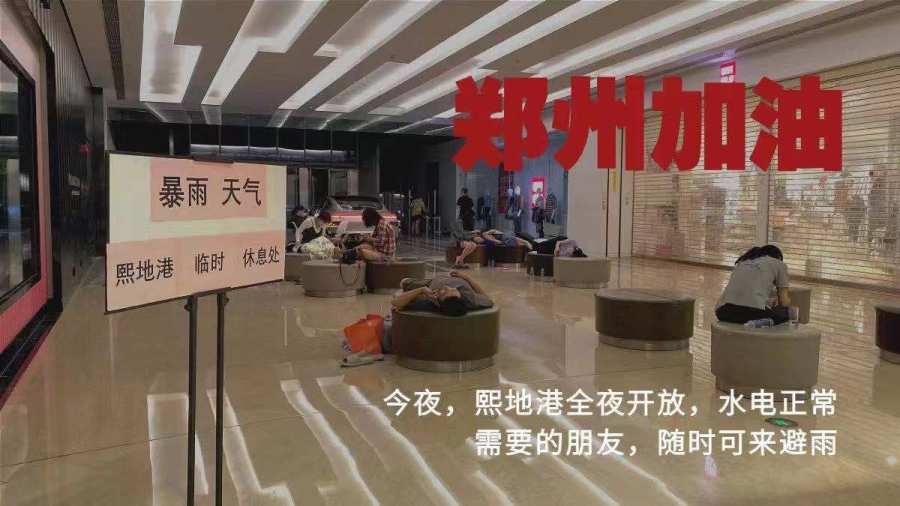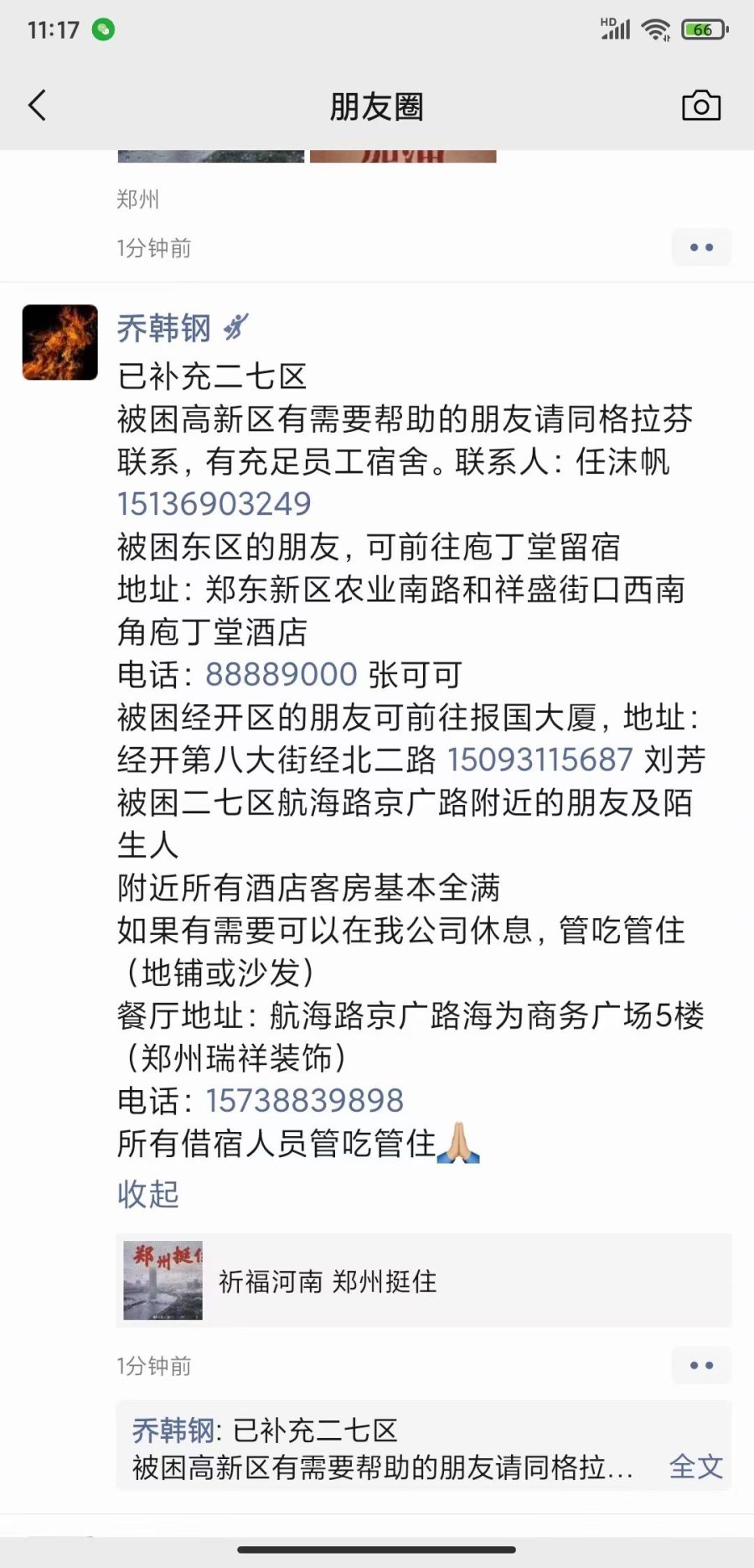 建业总部港附近滞留的朋友,可以到D座八楼,我们提供休息的地方和饭食。联系电话:0371—889808882、通泰路宏昌街附近,万飨瓦罐可避雨休息,卡座、沙发可凑合过夜,提供饮用水,和简单食物,如需联系182399741883,凡是在郑东新区商务外环路七号,立基上东国际附近有需要帮助的朋友,可联系河南康辉:18838102668能提供避雨场所和简单食物。