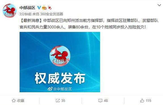 据中部战区官方微博消息,中部战区已向郑州派出前方指挥部,指挥战区驻豫部队、武警部队官兵和民兵力量3000余人、装备80余台,在10个地域同步投入抢险救灾。