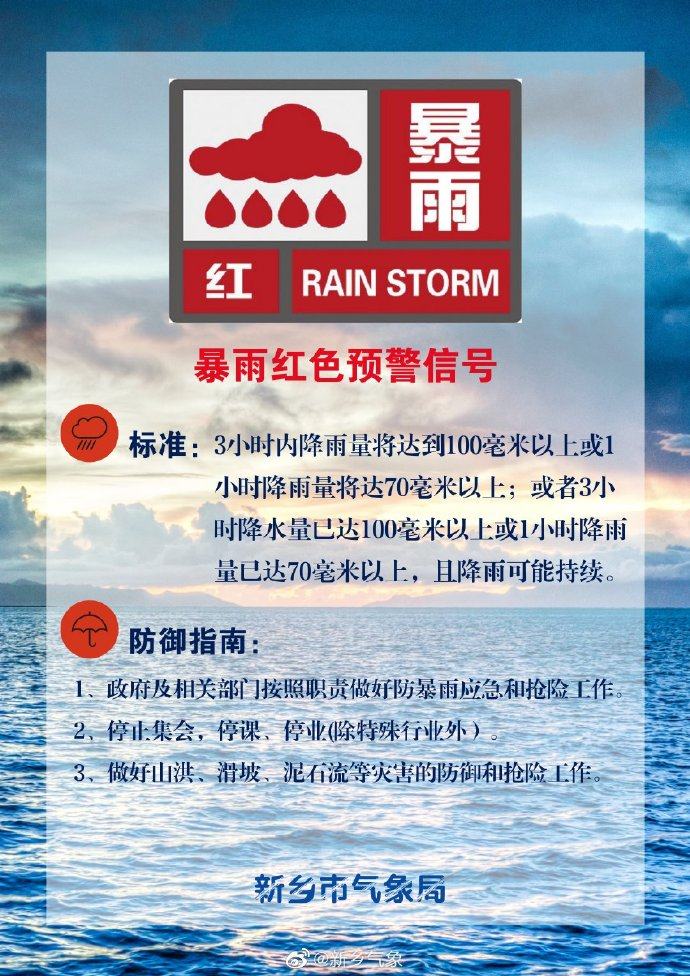 新乡气象台继续发布暴雨红色预警信号