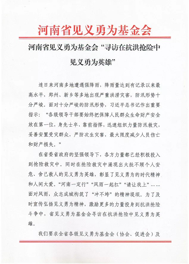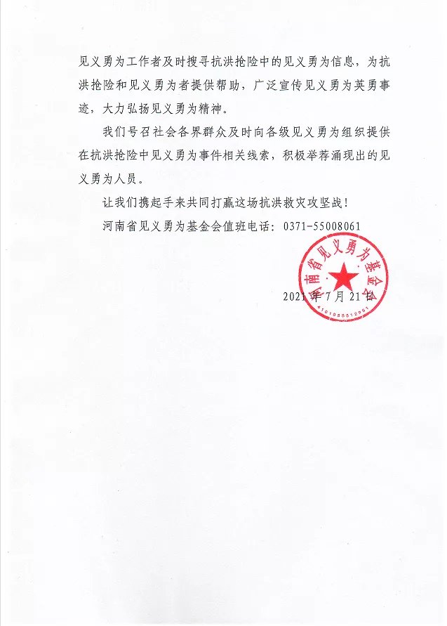 河南省见义勇为基金会特向社会公布值班电话0371-55008061,面向社会寻访河南范围内在抗洪抢险中的见义勇为英雄。如果您为他人伸出援手,或您的家人朋友亲历救人过程,或您是被救者可提供救援者相关信息,欢迎您致电!我们相信人间有大爱,我们不应让好人成为“无名好人”,让我们相信,河南一定中!