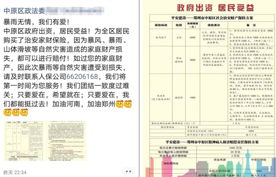 除此之外,有媒体透露,郑州市中原区政法委此前就为全区居民购买了一份治安保险。据了解,只要有了这份保险,全区居民如果因发生暴雨、暴风、山体滑坡等自然灾害造成的家庭财产损失,都可以得到赔付。这项保险由政府出资受益人却是每一个老百姓。据了解,这种保险每户能得到最高1万元的保障额度。根据第七次人口普查显示的数据,中原区常住人口为96.26万人,中原区政府已经为全体居民投保。