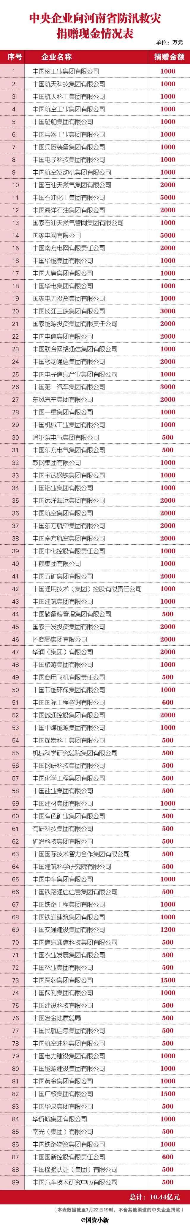 国资委和中央企业坚决贯彻落实习近平总书记关于防汛救灾的重要指示精神,落实党中央、国务院决策部署,全力支援河南省做好汛灾抢险救援,进一步加大捐赠力度,截至7月22日19点,89家中央企业累计向河南省捐赠现金达10.44亿元(不含其他渠道的中央企业捐款)。