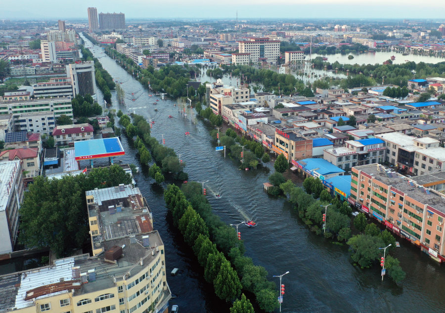 7月26日,在河南省卫辉市,救援船只穿梭于城区内(无人机照片)。图源:新华社