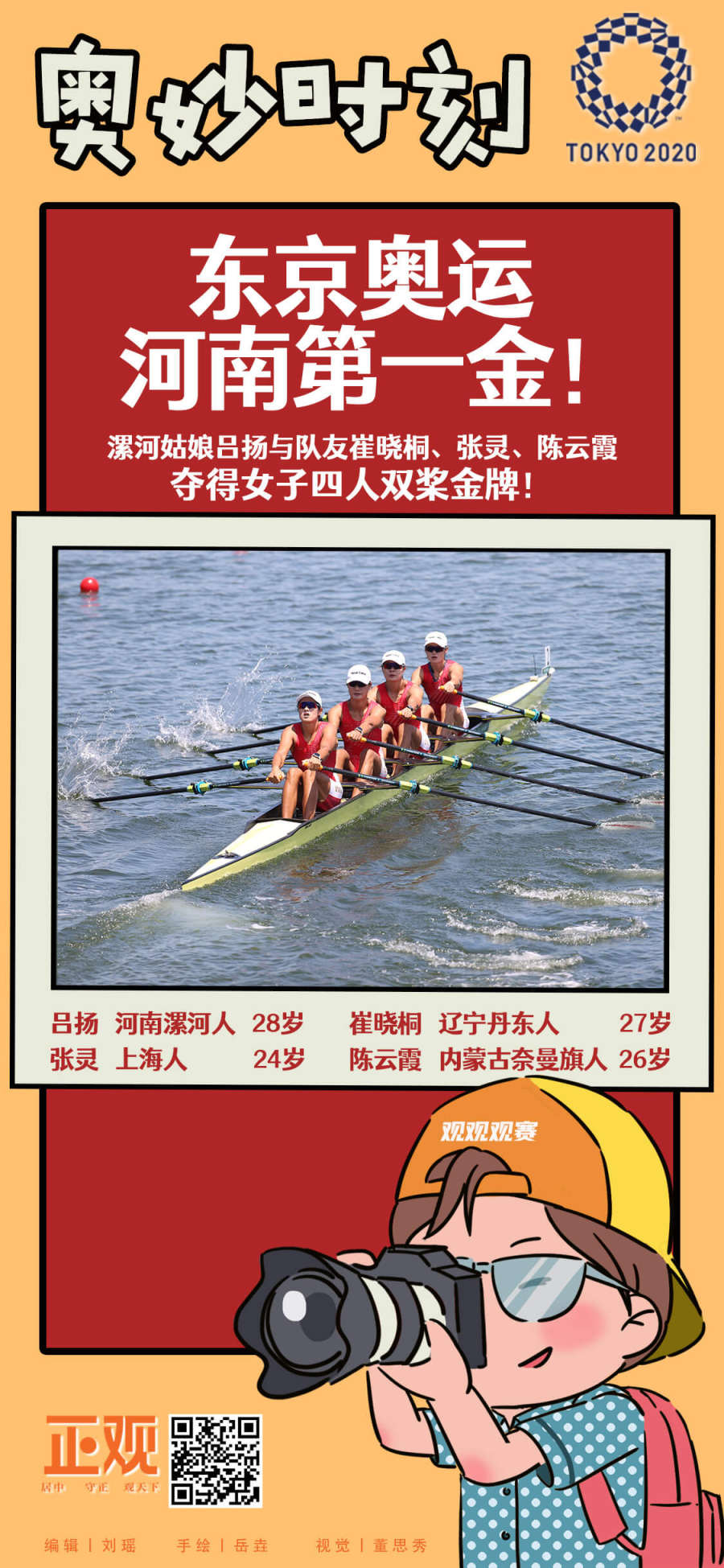 最值得期待的是女子四人双桨比赛,漯河姑娘吕扬与队友崔晓桐、张灵、陈云霞携手出战。在预赛中,中国组合的成绩排名第一,较之本组第二名和另一组头名都有4秒左右的巨大优势。2008年北京,中国赛艇正是在这个项目上实现了奥运金牌“零的突破”,13年后,这枚金牌有望重归中国。