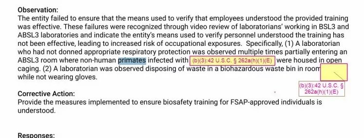 此外,已经感染病毒的非人灵长类动物就被简单关在笼子里,多名人员不佩戴适当的呼吸保护装置就直接进入了实验室;一些人员在处理生物危害性废物时,根本不戴手套;一名工作人员转移有害生物废料时,打开了高压灭菌室的门——严重增加了受污染空气从房间进入高压灭菌室的风险,而灭菌室内里的人员都没有佩戴呼吸防护设备。