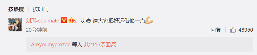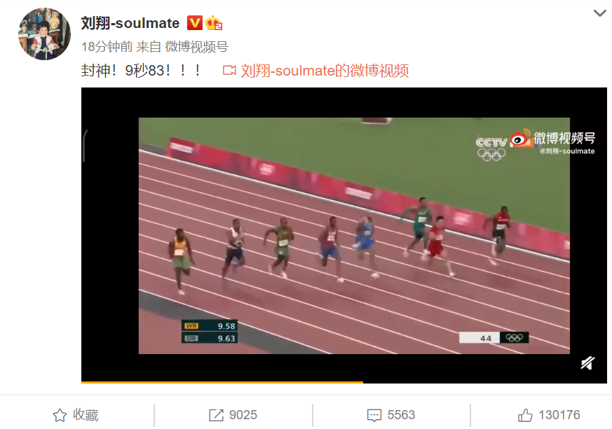 中国跨栏名将刘翔第一时间发博表示祝贺:封神!9秒83!还在评论区写道:“决赛,请大家把好运借他一点