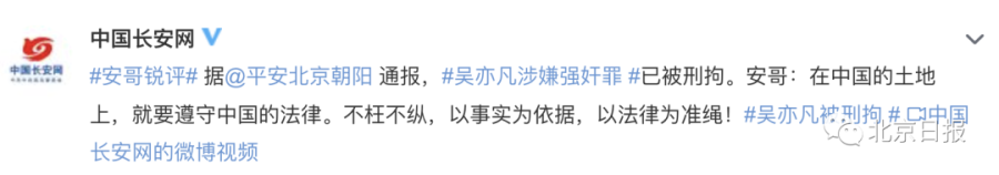 7月31日晚,北京市公安局朝阳分局发布消息称:针对网络举报的“吴某凡多次诱骗年轻女性发生性关系”等有关情况,经警方调查,吴某凡(男,30岁,加拿大籍)因涉嫌强奸罪,目前已被朝阳公安分局依法刑事拘留,案件侦办工作正在进一步开展。