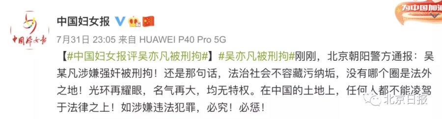 7月31日,北京警方发布消息,吴亦凡因涉嫌强奸罪,已被依法刑事拘留。8月1日,吴亦凡@Mr_凡先生 和吴亦凡工作室@Mr_吴亦凡工作室 的微博都已经被注销!