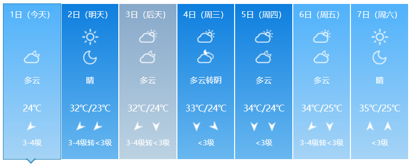 08月02日(星期一):多云间晴天,东北风3-4级,24℃~32℃;