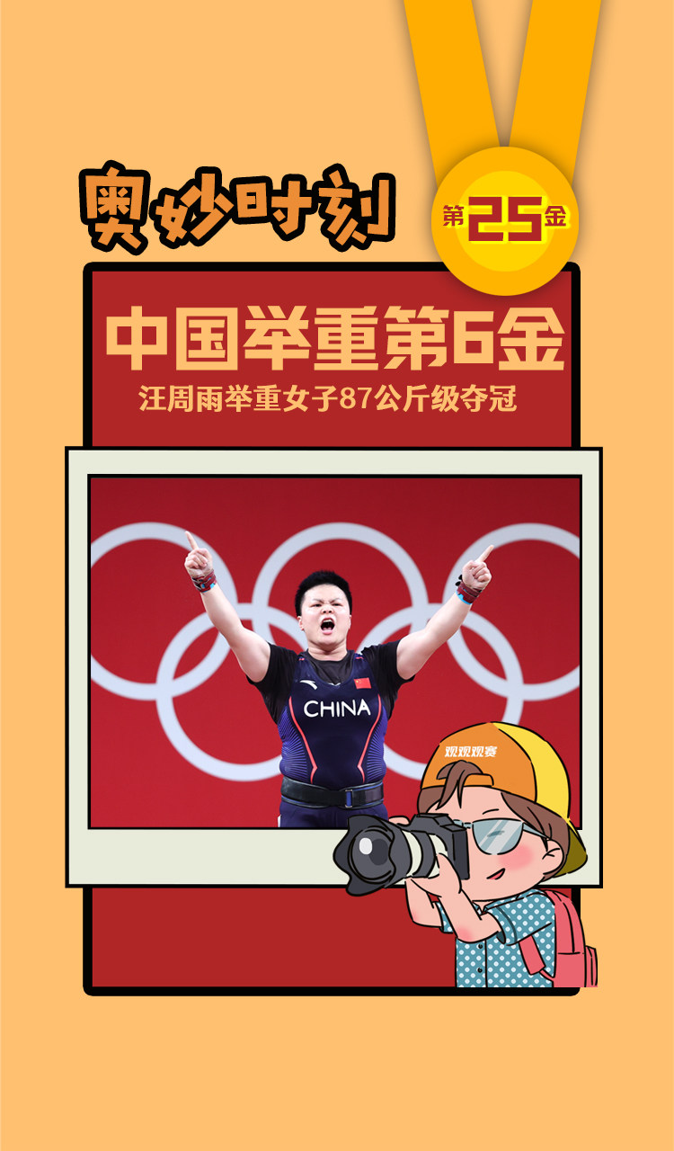 2021年8月2日,汪周雨获得东京奥运会举重女子87公斤级金牌。这是中国代表团在此次奥运会中获得的第25枚金牌。