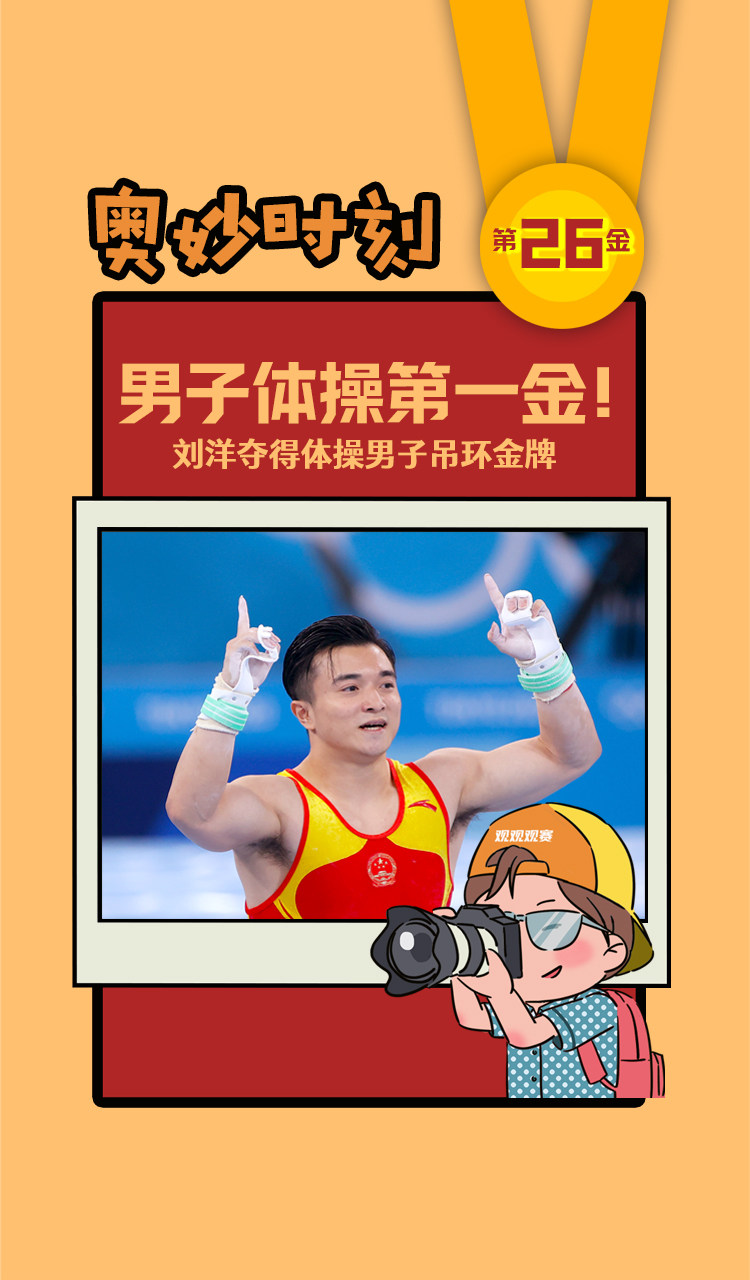 在东京奥运会体操男子吊环决赛中,中国选手刘洋夺得冠军,这也是中国代表团的第26枚金牌。尤浩获得亚军,中国选手包揽该项目金银牌。