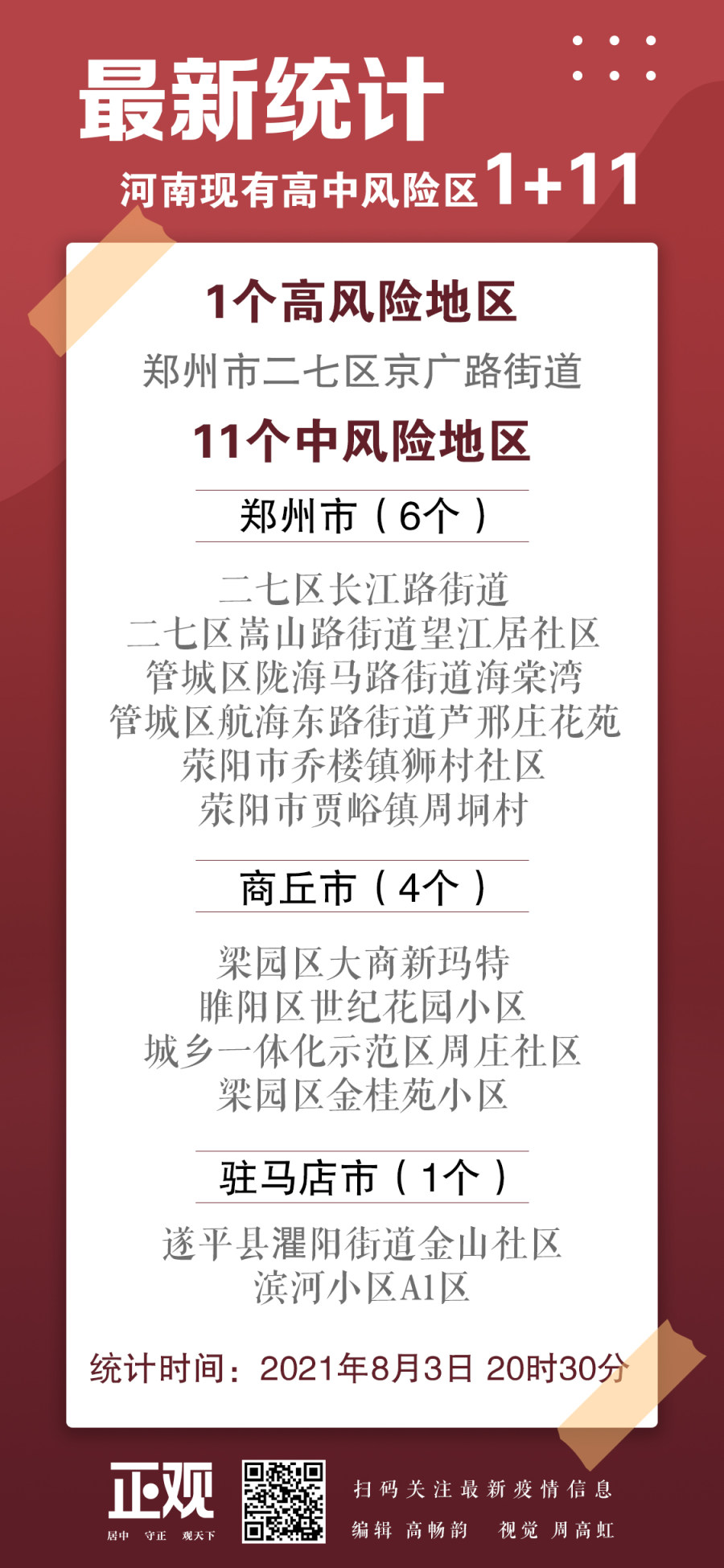 截至2021年8月3日20时30分,河南共有高风险区1个、中风险区11个,分布在郑州、商丘、驻马店三地。