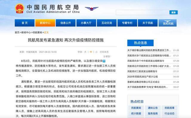 8月2日,民航局针对当前国内疫情防控的严峻形势,以及德尔塔变异株传播速度快、防控难度大等特点,发布紧急通知,要求通过进一步加密工作人员核酸检测频次,全面强化机上及机场防控措施等,进一步加强国内航班、机场疫情防控工作。