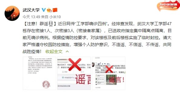近日,网传“武汉大学工学部确诊四例”。据@武汉大学,经排查发现,武汉大学工学部47栋存在密接1人、次密接3人(密接者家属),已送政府指定集中隔离点隔离,目前无确诊病例。根据疫情防控要求,对该楼栋及前后楼栋实施了临时封控。请大家增强个人防护意识,不造谣、不信谣、不传谣!