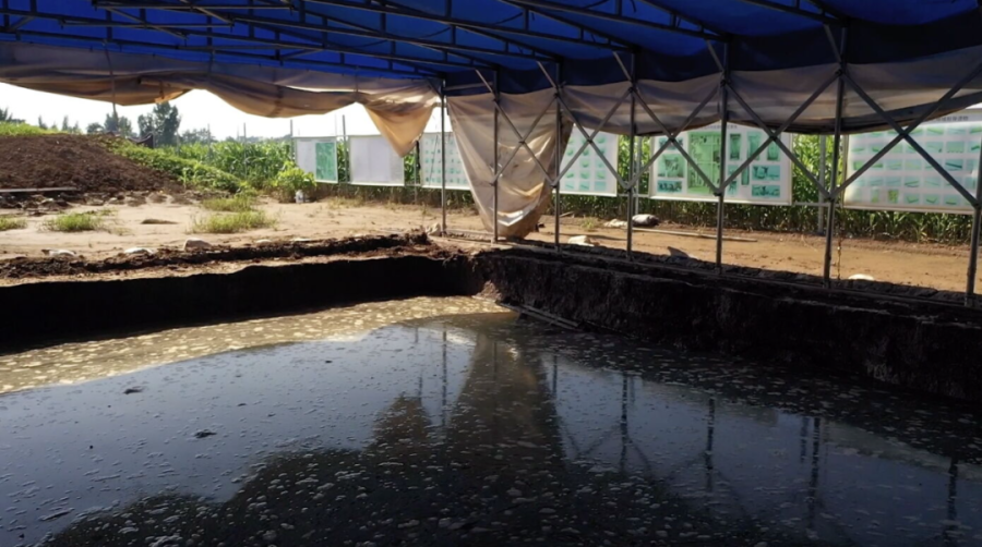 7月26日拍摄的安阳洹北商城制陶制骨作坊遗址考古工地,考古探方内仍有大量积水。(视频截图)