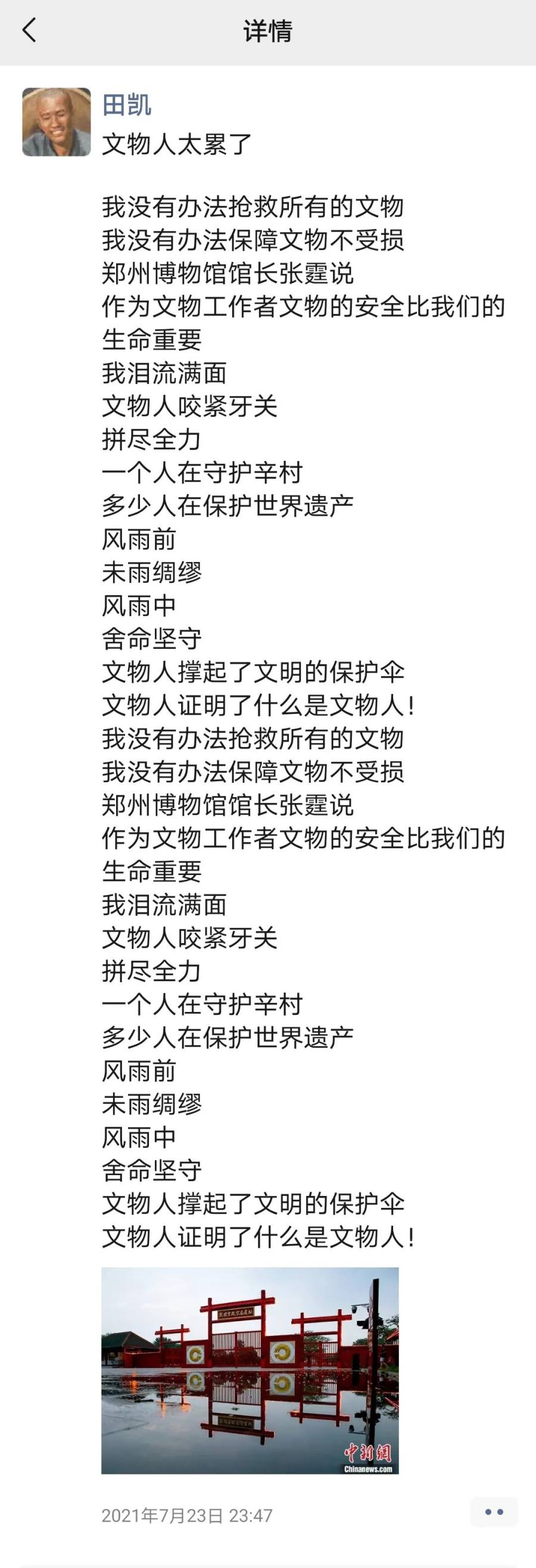“风雨中,舍命坚守,文物人咬紧牙关,拼尽全力,”河南省文物局局长田凯在朋友圈中写道,“作为文物工作者,文物的安全比我们的生命重要。我泪流满面……”