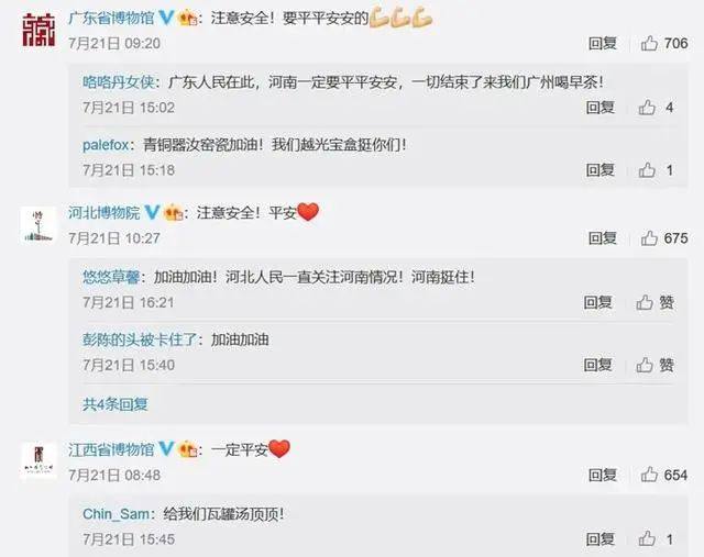 “加油!”“风雨同舟,盼平安!”“人和文物都要平安!”……在河南博物院的微博评论区,四川广汉三星堆博物馆、苏州博物馆、长沙博物馆、山西博物馆、河北博物馆等全国多所博物院(馆)的留言令人动容。