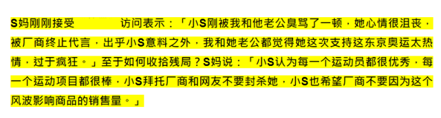 随后,又有媒体采访到小S的妈妈,S妈表示,小S被妈妈和老公臭骂一顿,目前小S心情很沮丧,终止代言完全出乎小S的意料之外。S妈还说每个运动员都很优秀,每一个运动项目都很棒,同时S妈还透露说:“小S拜托厂商和网友不要封杀她,同时小S也希望厂商不要因为这个风波影响商品的销售量”。