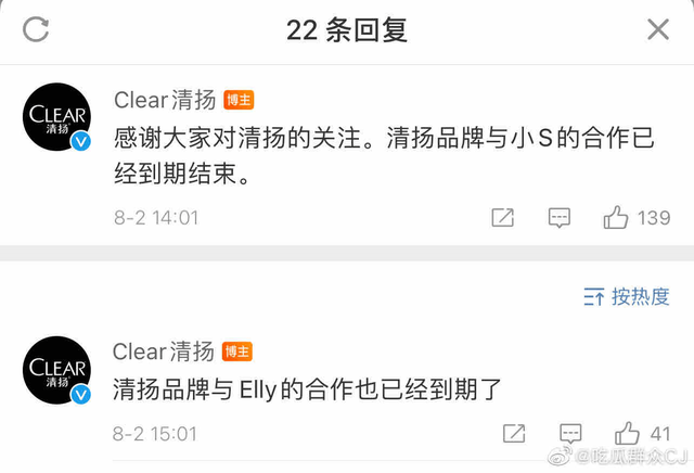到目前为止,多个小S以及她女儿许曦文代言的品牌宣布终止合作。其中包括清扬洗发水宣布与小S合作到期结束。寿全斋发布声明:寿全斋品牌即日起终止与徐熙娣女士(小S)的一切品牌合作。服装品牌JORYA宣布与小S大女儿许曦文的合作到期。几个月前小S刚签约的大人糖宣布与其解约。