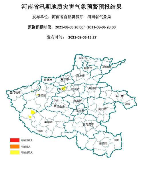 2021年08月05日20时至06日20时,河南省地质灾害预警预报达到黄色预警的地区为:郑州、南阳西北部,三门峡东部,洛阳中北部,巩义大部,发生地质灾害的可能性较大。 请注意防范。