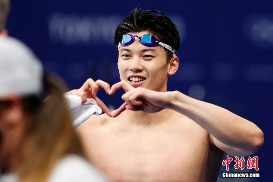 汪顺在东京奥运会男子200米个人混合泳决赛后庆祝夺冠。中新社记者 富田 摄