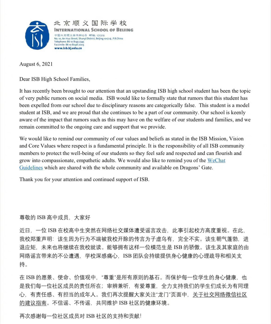 近日,网传黄磊女儿黄多多因在校行为不端被开除。8月6日下午,黄多多就读的北京顺义国际学校发布声明,表示传言子虚乌有,完全不实。并表示希望能严惩造谣者,每个女孩都应该在美好的环境中成长。
