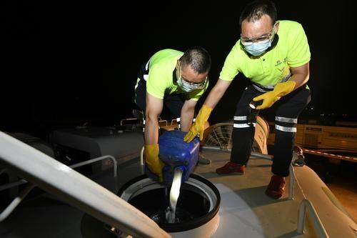 晚上21点30分,金水区机械化清扫车队停车场,几位环卫工人正忙着将消毒液倒入雾炮车厢内进行搅拌和充分稀释,为当晚10点的道路消毒工作做准备。