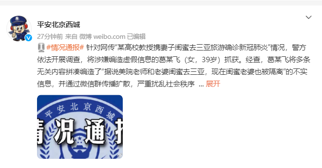 北京市公安局西城分局官方微博8月7日凌晨发布通报,针对网传“某高校教授携妻子闺蜜去三亚旅游确诊新冠肺炎”情况,警方依法开展调查,将涉嫌编造虚假信息的葛某飞(女,39岁)抓获。
