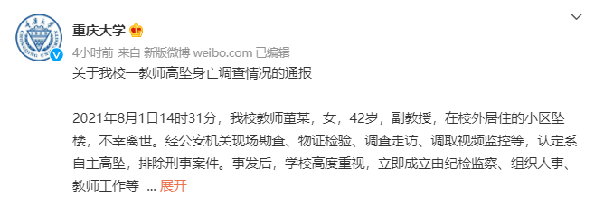 重庆大学通报副教授坠亡调查情况:未发现其遗书所反映问题