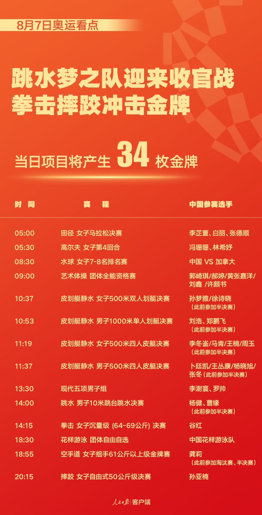 8月7日是东京奥运闭幕前一天,也将是产生金牌最多的一天。在34场金牌争夺战中,中国军团有望在跳水、皮划艇、拳击、摔跤等赛场有所斩获。