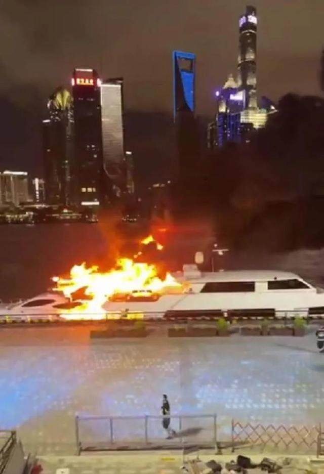 今晚7点多,上海白玉兰码头一艘停靠码头边的游艇着火。
