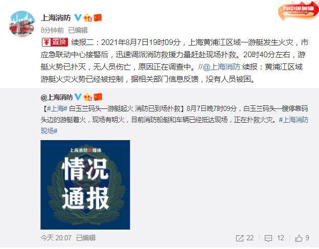 今晚9点12分,据@上海消防 通报,8月7日19时09分,上海黄浦江区域一游艇发生火灾,市应急联动中心接警后,迅速调派消防救援力量赶赴现场扑救。20时40分左右,游艇火势已扑灭,无人员伤亡,原因正在调查中。