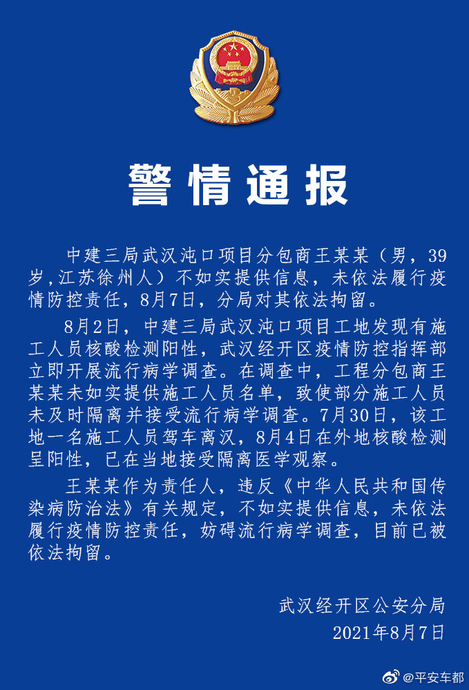 8月2日,中建三局武汉沌口项目工地发现7名人员核酸检测阳性,武汉经开区疫情防控指挥部立即按照疫情防控要求迅速进行流行病学调查。在调查中,该工地工程分包商王某某未如实报告曾在工地工作的人员名单,致使一名7月30日驾车离开武汉的工地施工人员,未接受流行病学调查。8月4日,该施工人员在外地核酸检测结果为阳性,已在当地接受隔离医学观察。