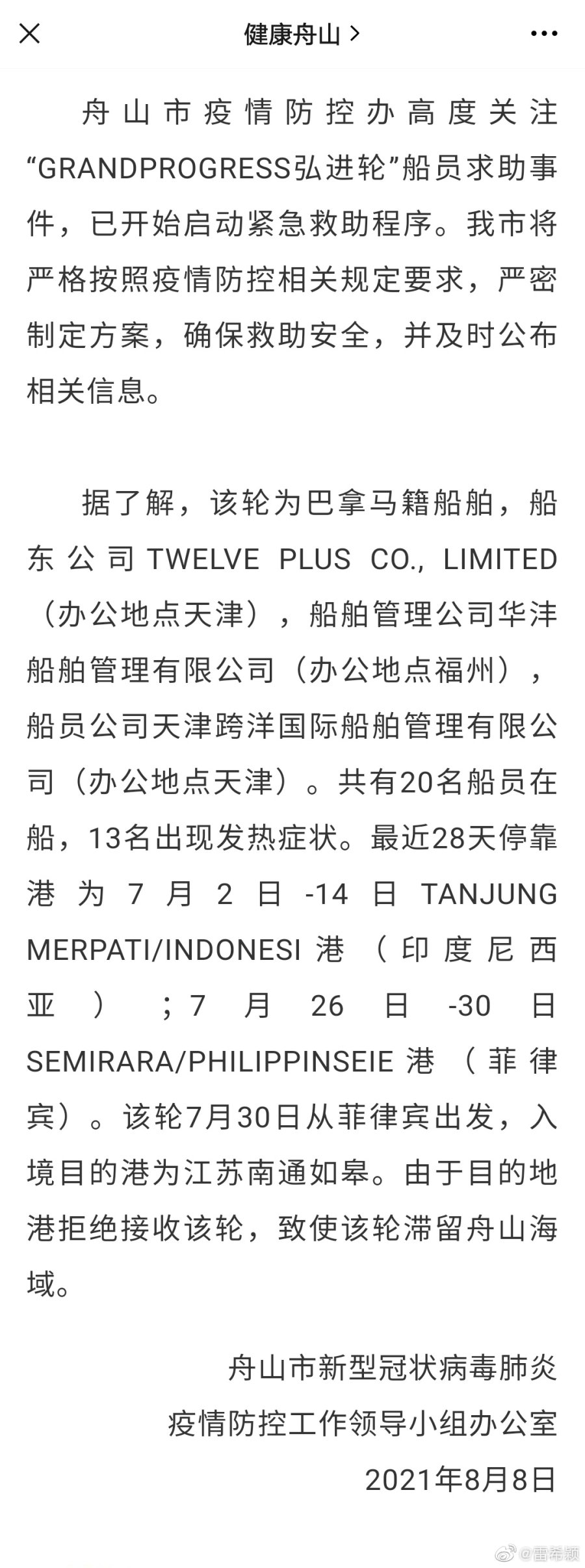 据了解,该轮为巴拿马籍船舶,船东公司TWELVE PLUS CO., LIMITED(办公地点天津),船舶管理公司华沣船舶管理有限公司(办公地点福州),船员公司天津跨洋国际船舶管理有限公司(办公地点天津)。共有20名船员在船,13名出现发热症状。最近28天停靠港为7月2日-14日TANJUNG MERPATI/INDONESI港(印度尼西亚);7月26日-30日SEMIRARA/PHILIPPINSEIE港(菲律宾)。该轮7月30日从菲律宾出发,入境目的港为江苏南通如皋。由于目的地港拒绝接收该轮,致使该轮滞留舟山海域。