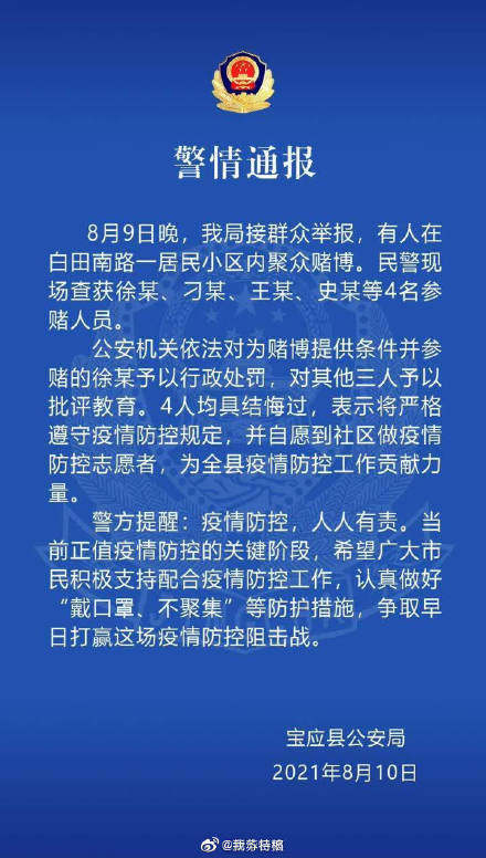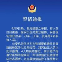 据扬州宝应县公安局:8月9日晚,我局接群众举报,有人在白田南路一居民小区内聚众赌博。民警现场查获徐某、刁某、王某、史某等4名参赌人员。
