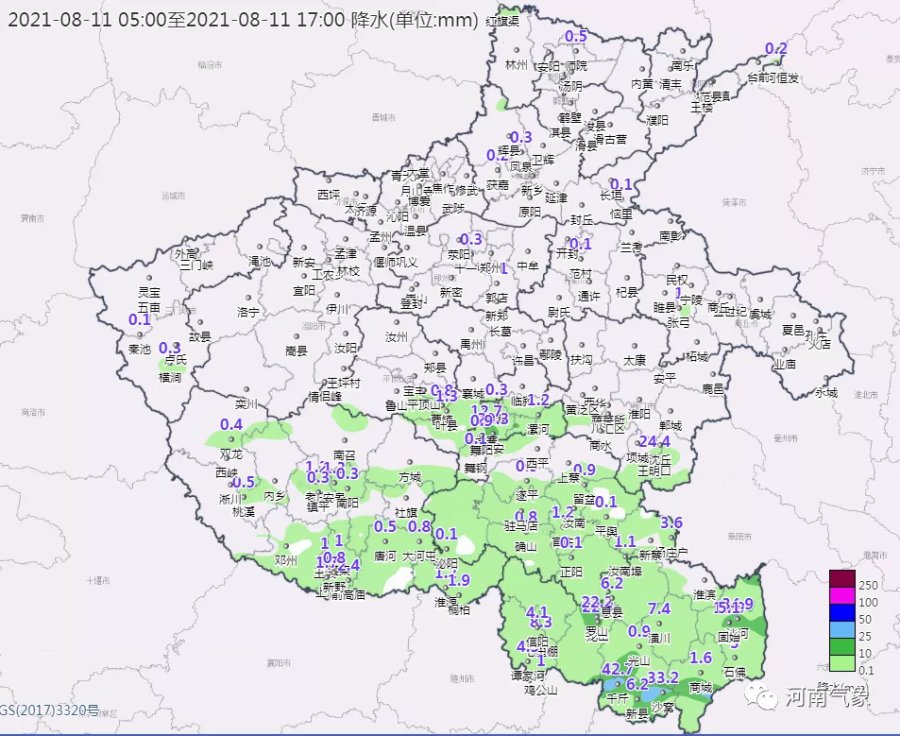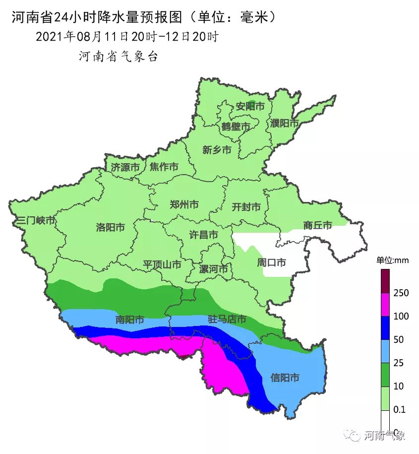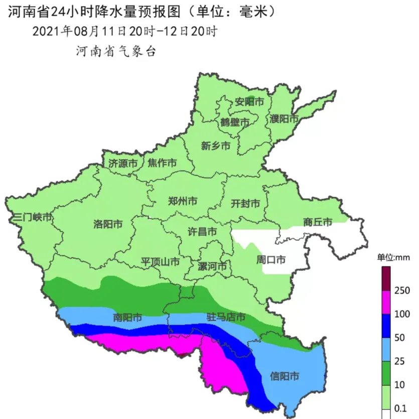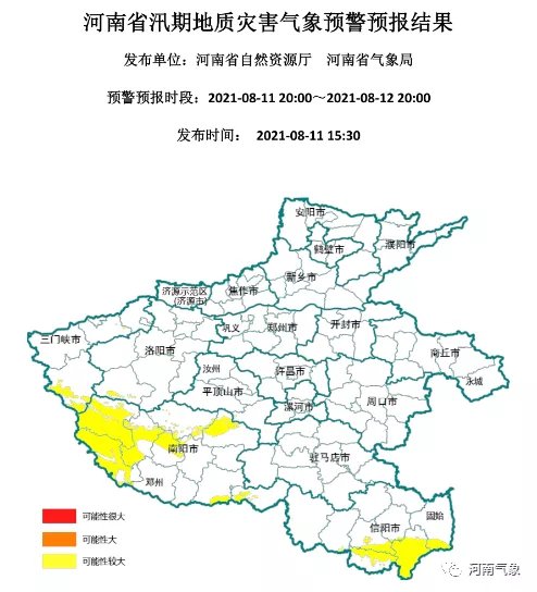 2021年08月11日20时至12日20时,河南省地质灾害预警预报达到黄色预警的地区为:南阳大部,三门峡南部及东部局部,信阳、洛阳、平顶山南部,邓州西南部,固始南部,发生地质灾害的可能性较大。(河南省自然资源厅 河南省气象局联合发布)