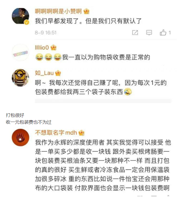 有人觉得也正常,收一元包装费不为过。↓