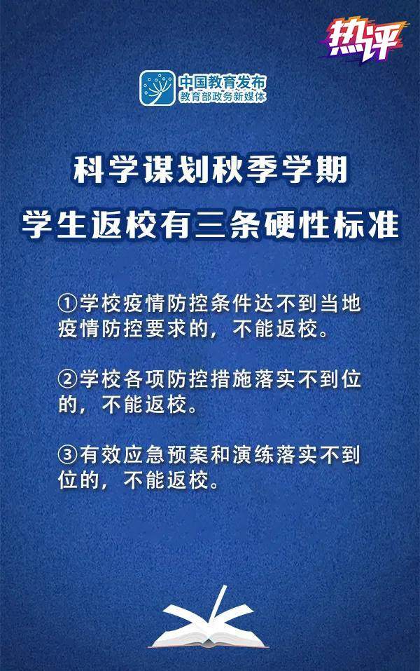 近日,教育部召开全国教育系统疫情防控工作视频调度会议,对科学谋划秋季学期学生返校提出三条硬性标准:学校疫情防控条件达不到当地疫情防控要求的,不能返校;学校各项防控措施落实不到位的,不能返校;有效应急预案和演练落实不到位的,不能返校。
