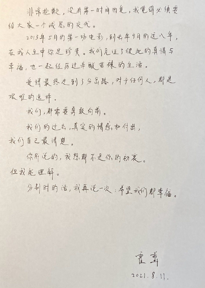 对此,霍尊以手写信回应