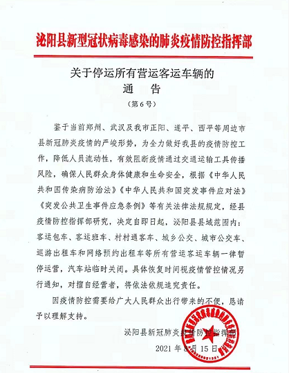 鉴于当前郑州、武汉及我市正阳、遂平、西平等周边市县新冠肺炎疫情的严峻形势,为全力做好我县的疫情防控工作,降低人员流动性,有效阻断疫情通过交通运输工具传播风险,确保人民群众身体健康和生命安全,根据《中华人民共和国传染病防治法》《中华人民共和国突发事件应对法》《突发公共卫生事件应急条例》等有关法律法规规定,经县疫情防控指挥部研究,决定自即日起,泌阳县县域范围内:客运包车、客运班车、村村通客车、城乡公交、城市公交车、巡游出租车和网络预约出租车等所有营运客运车辆一律暂停运营,汽车站临时关闭。具体恢复时间视疫情管控情况另行通知,对擅自经营者,将依法依规追究责任。
