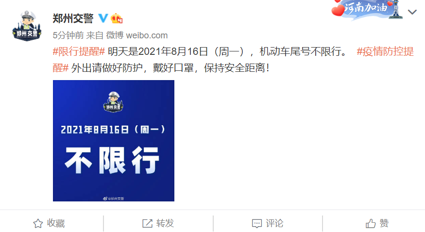 据@郑州交警,明天是2021年8月16日(周一),机动车尾号不限行。