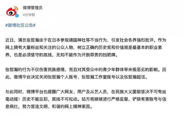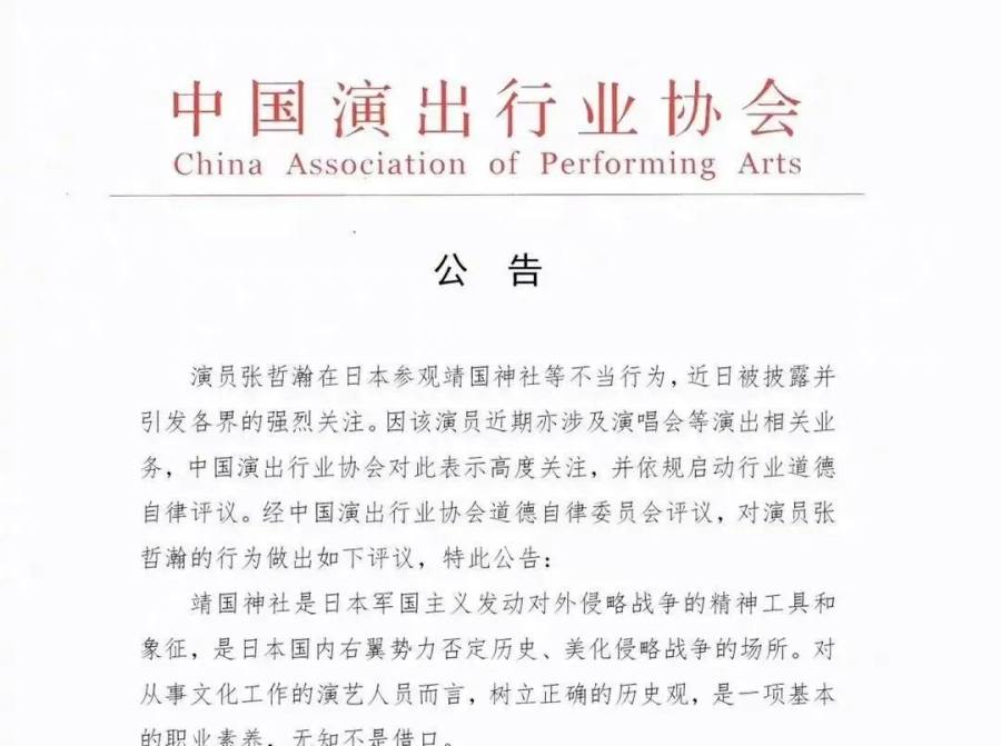 今天,中国演出行业协会发布公告,对演员张哲瀚参观靖国神社的不当行为进行道德申斥,并根据《演出行业演艺人员从业自律管理办法》的规定,要求会员单位对其进行从业抵制。