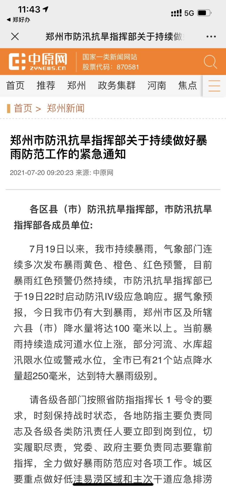 中原网发布《郑州市防汛抗旱指挥部关于持续做好暴雨防范工作的紧急通知》